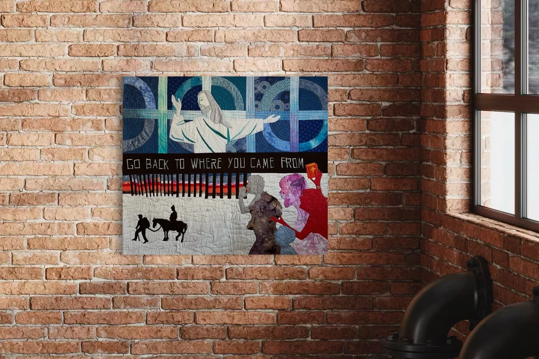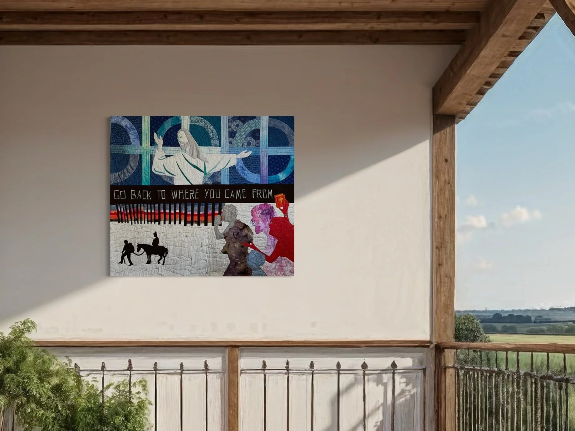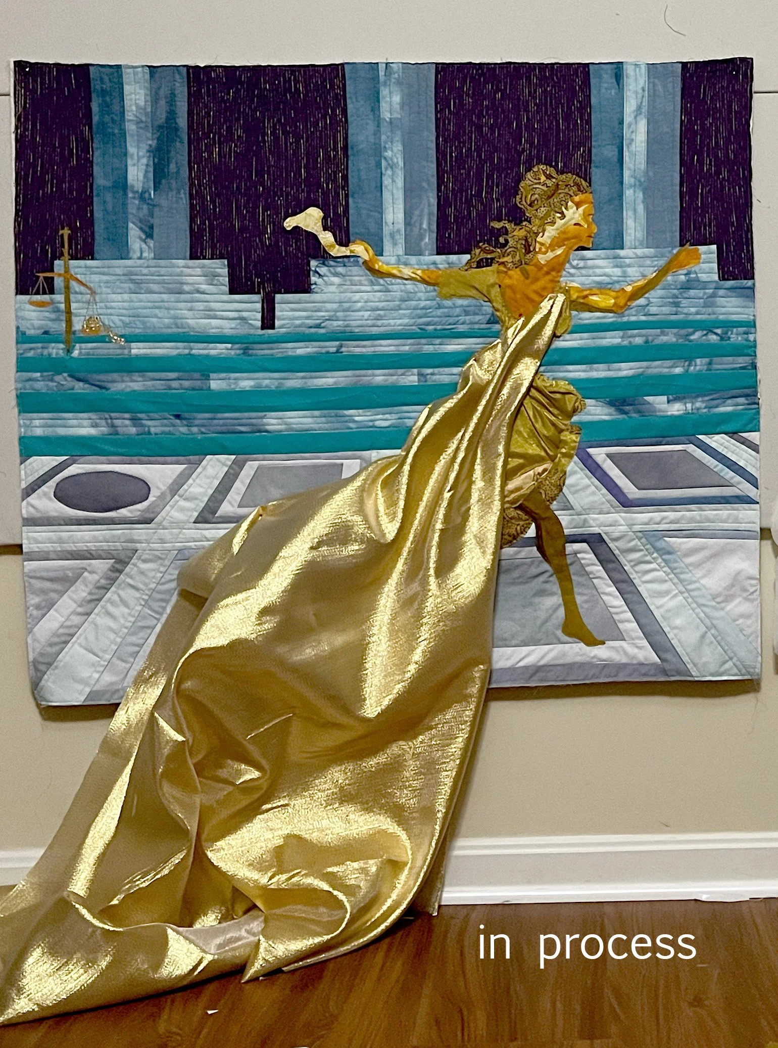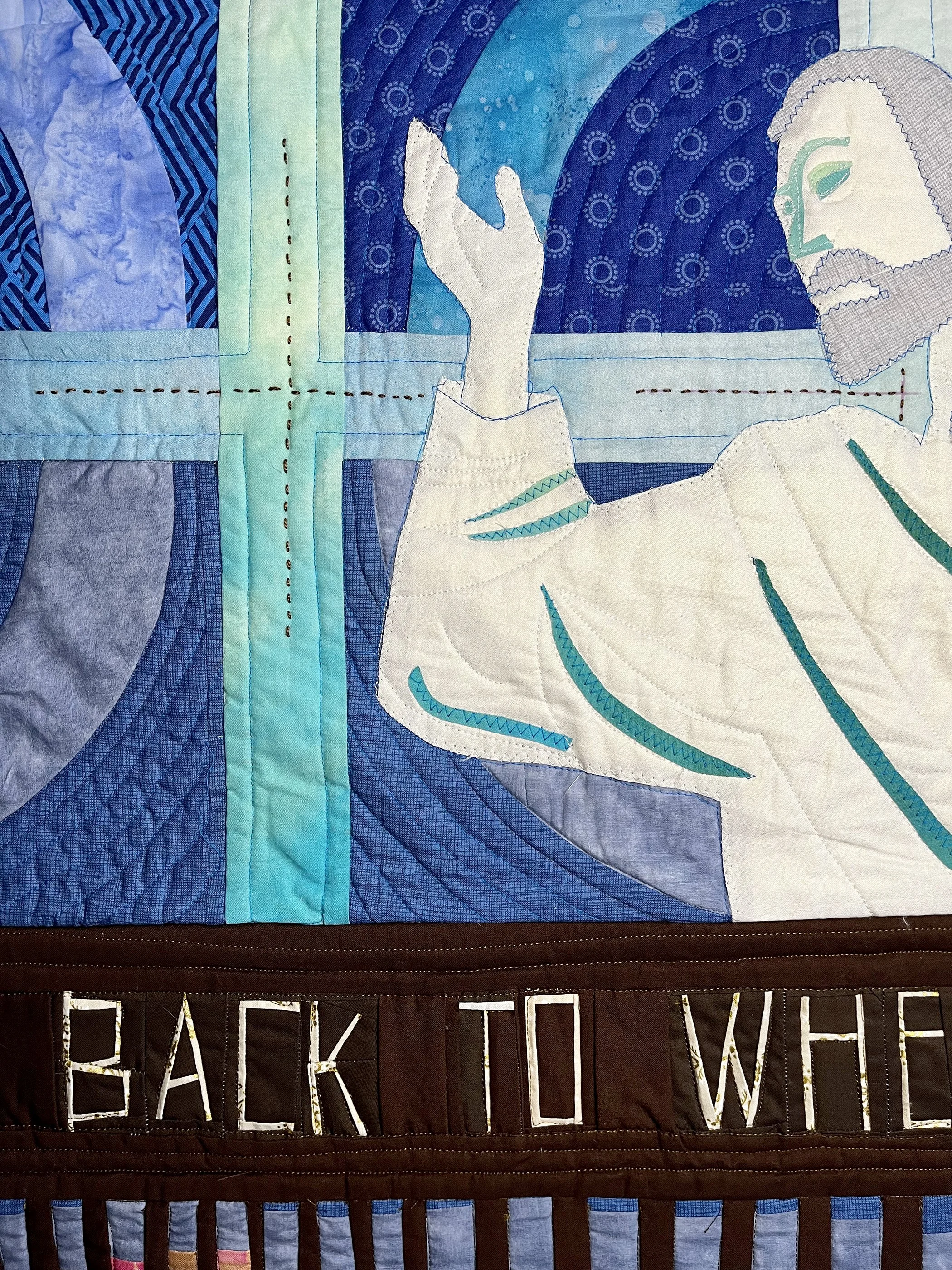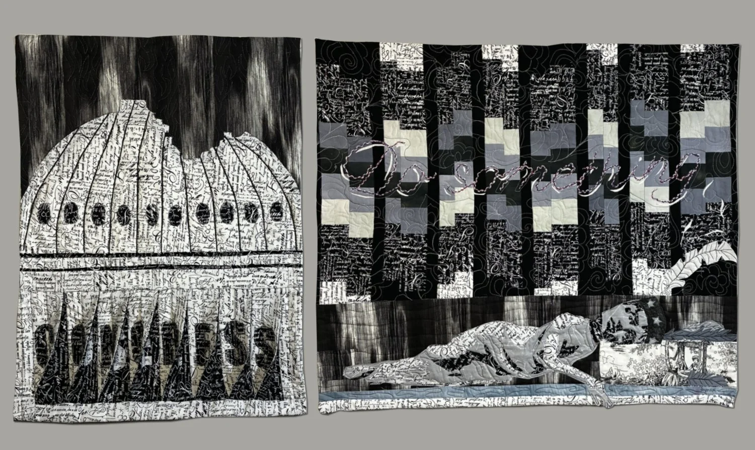 What’s the use of Congress? It does nothing. It is paralyzed. It is a reflection of our divided nation. The fractured Capitol dome and the fallen Statue of Freedom—the figure that crowns the dome—symbolize a democracy that has lost its strength and unity. Once meant to represent the people’s voice, Congress now mirrors our collective inability to agree. The quilt carries a hidden message: when viewed from the right or left, the imagery reveals different perspectives, emphasizing how our division shapes what we see. Through this layered composition, the work asks viewers to reflect, engage, and ultimately “do something.”
